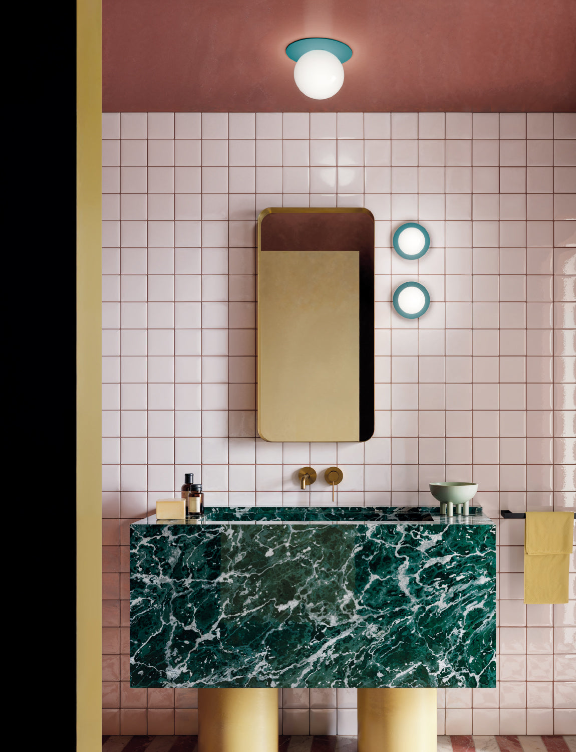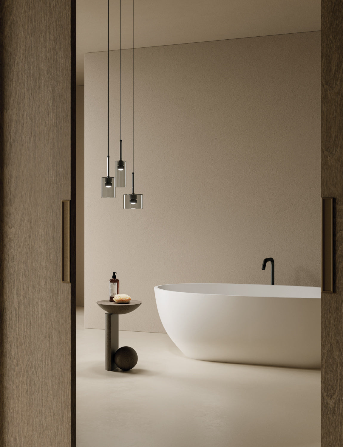 A few carefully chosen elements come together with effortless elegance, creating refined objects where attention to detail is paramount. Blown glass spheres transform into pure light, gently resting on colored metal discs that seem to float in space, while advanced technology operates seamlessly within.