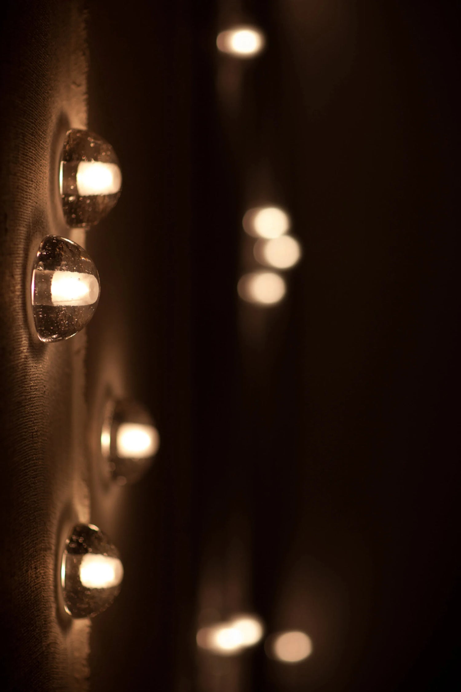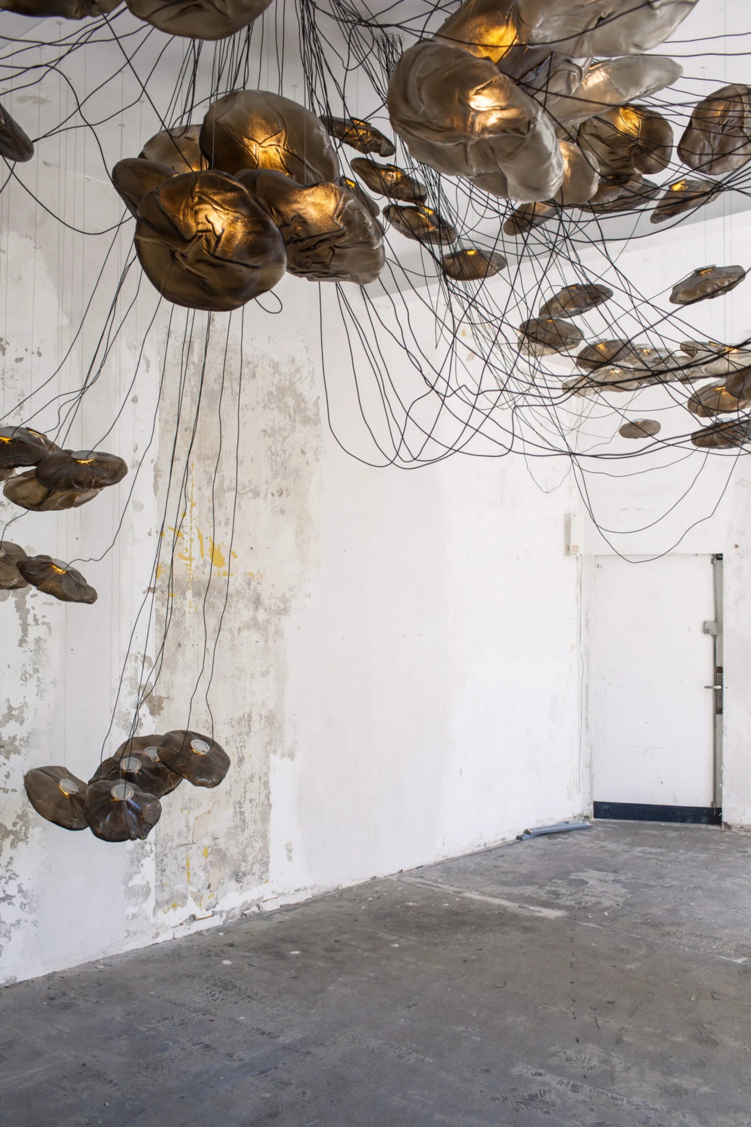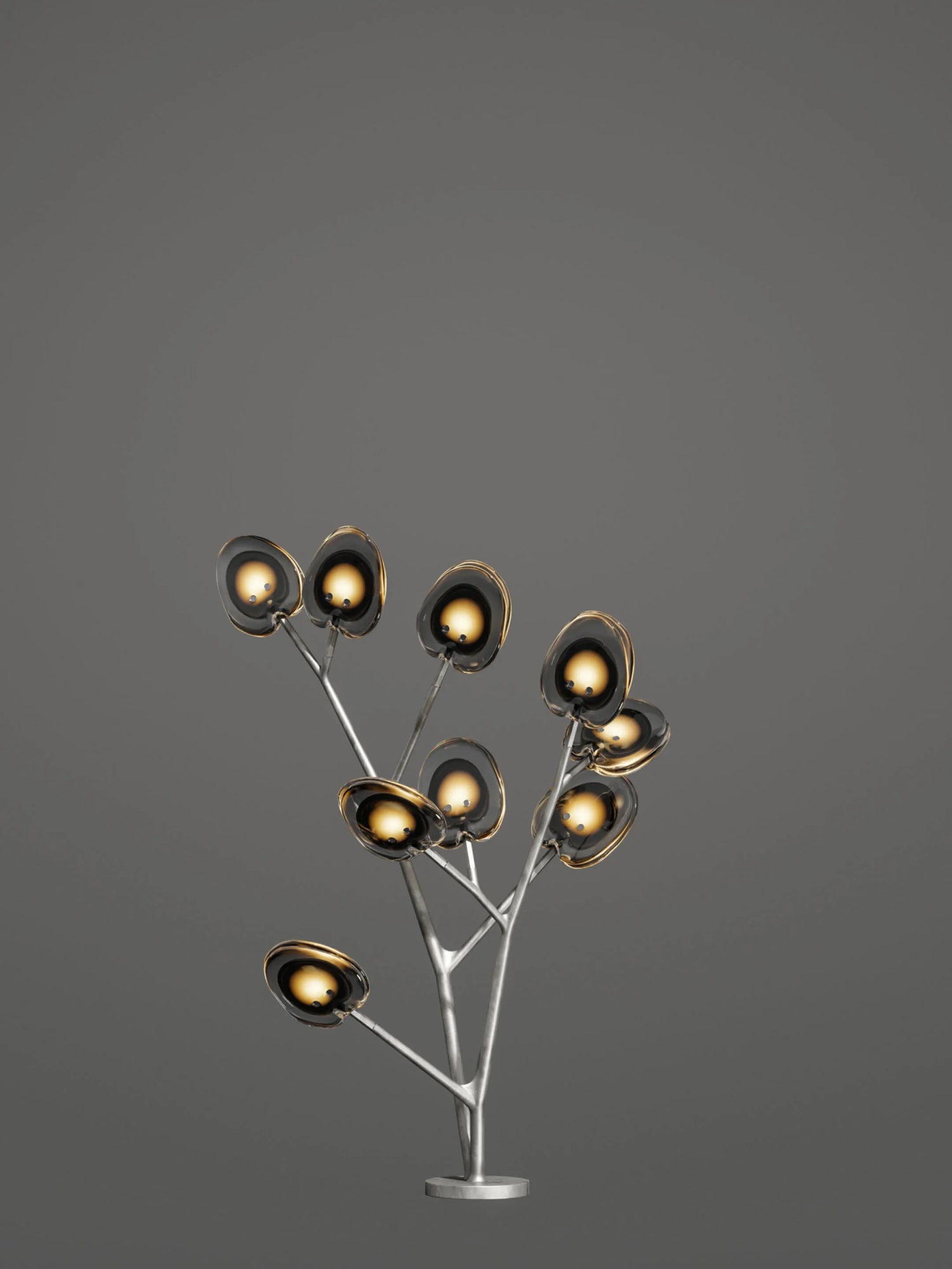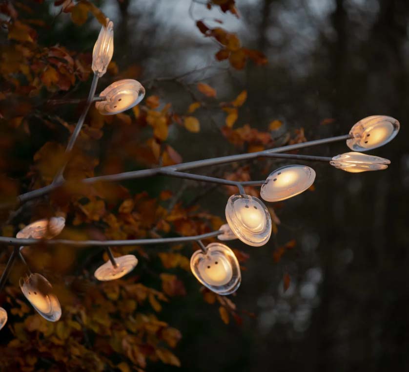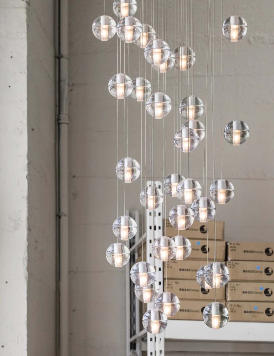 16.9 is a tree-like installation featuring nine pendants and a modular stainless-steel armature system. Each armature segment carries low-voltage electricity.