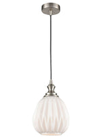 In satin nickel finish with a black braidedc able and a 180mm diameter matt white glass.