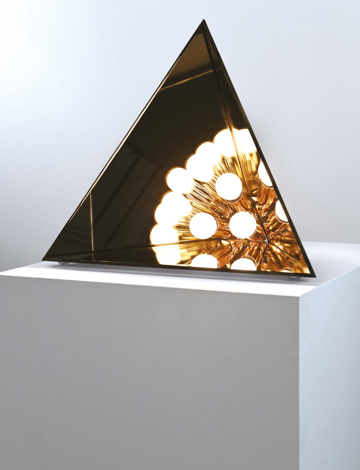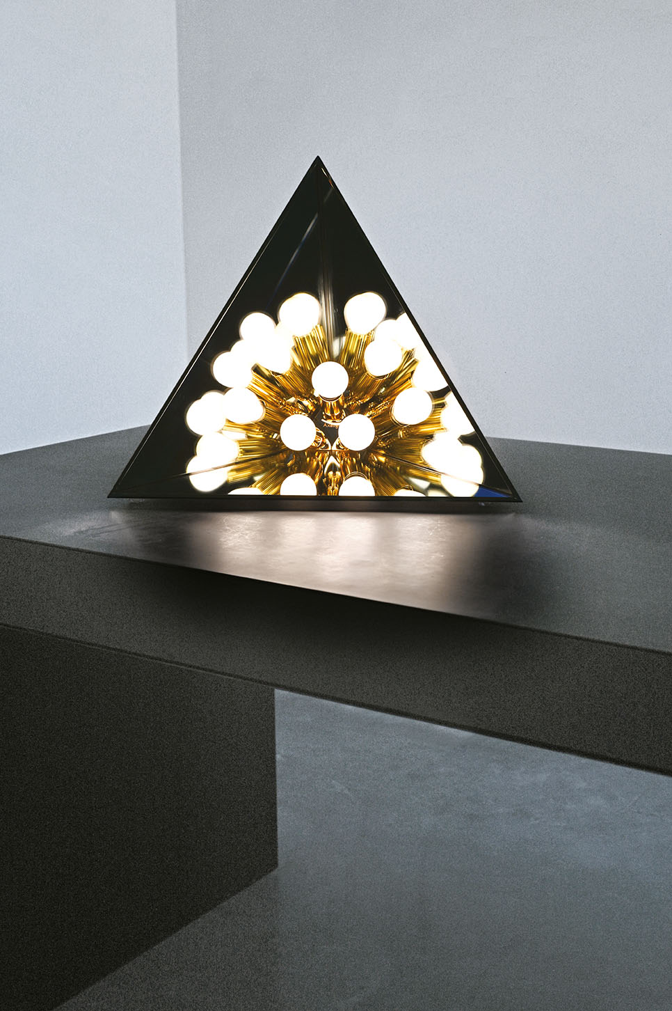 Kaleidolight is a mesmerizing play of reflections, an infinite maze of light with no clear beginning or end-both a visual marvel and illusion. This table lamp takes the form of an open-sided pyramid, where three strategically placed bulbs interact with mirrored glass to create endless reflections. The result is a captivating light installation that transforms any space into a timeless work of art.