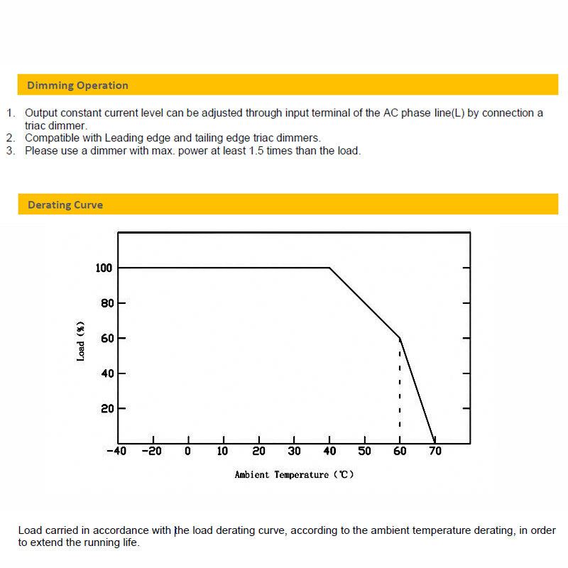 1. All parameters NOT specially mentioned are measured at 230VAC input, rated load and 25°C ambient temperature. 2. To extend the driver's use life, reduce the loading at lower input voltage. 3. Loading range from 10% to 100%. |