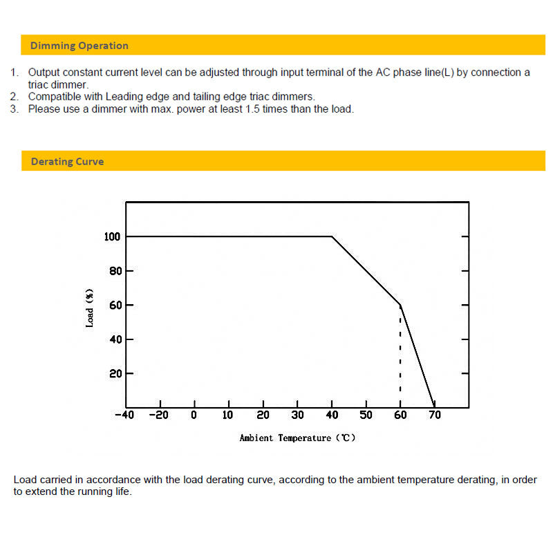 | 1. All parameters NOT specially mentioned are measured at 230VAC input, rated load and 25°C ambient temperature. 2. To extend the driver's use life, reduce the loading at lower input voltage. 3. Loading range from 10% to 100%. |