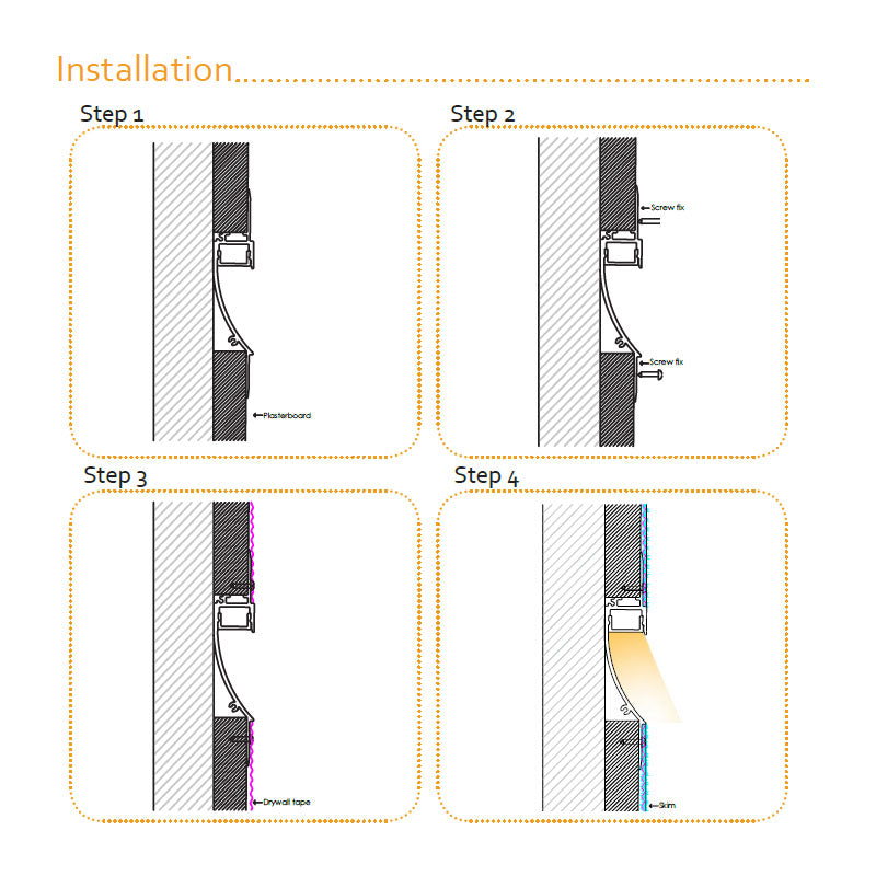 Product Description Aluminium LED profile with flange, recessed into 5/8" drywall for trimless, seamless installations.