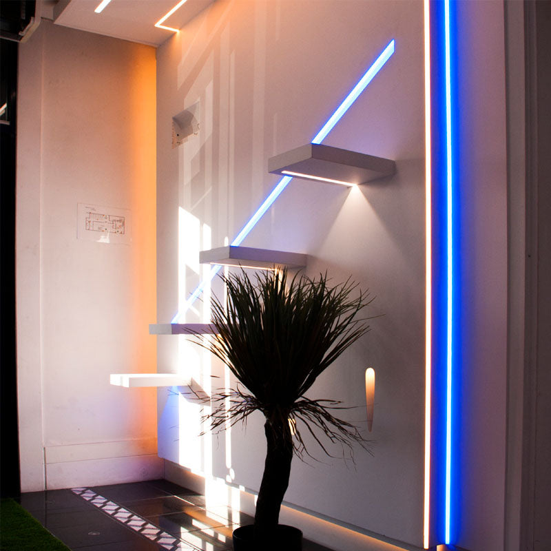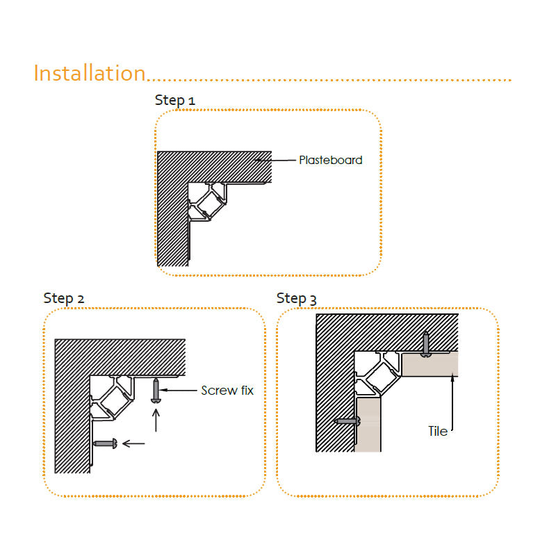 Product Description Aluminium LED profile with flange, recessed into 10mm tile or marble, inside corner.