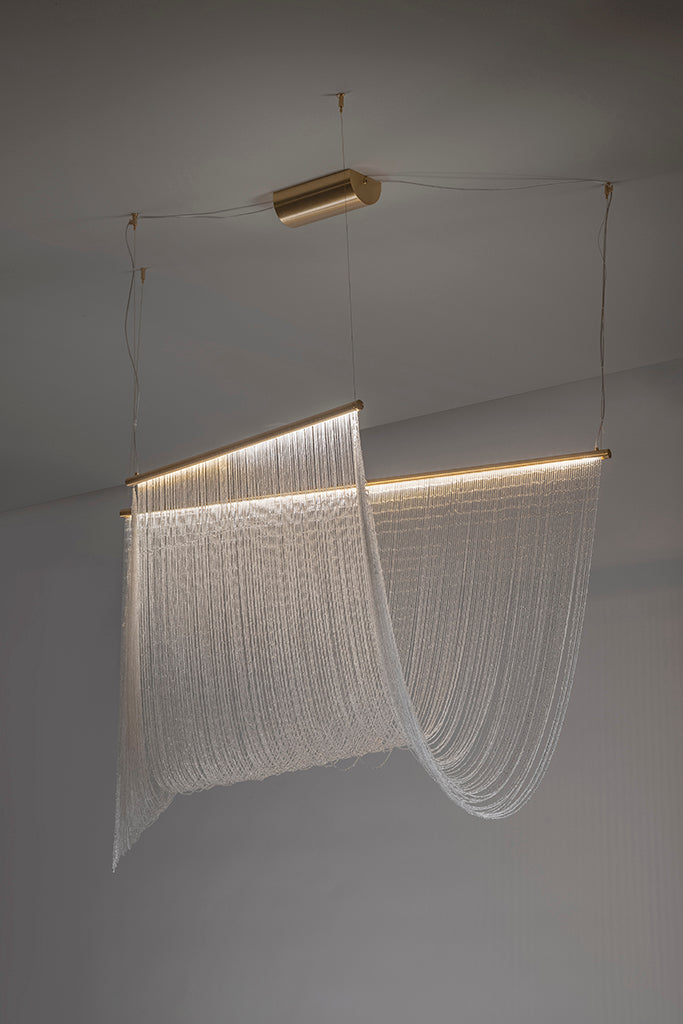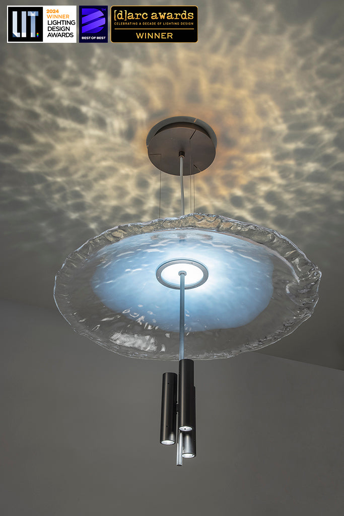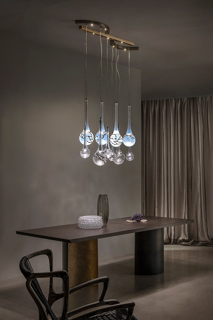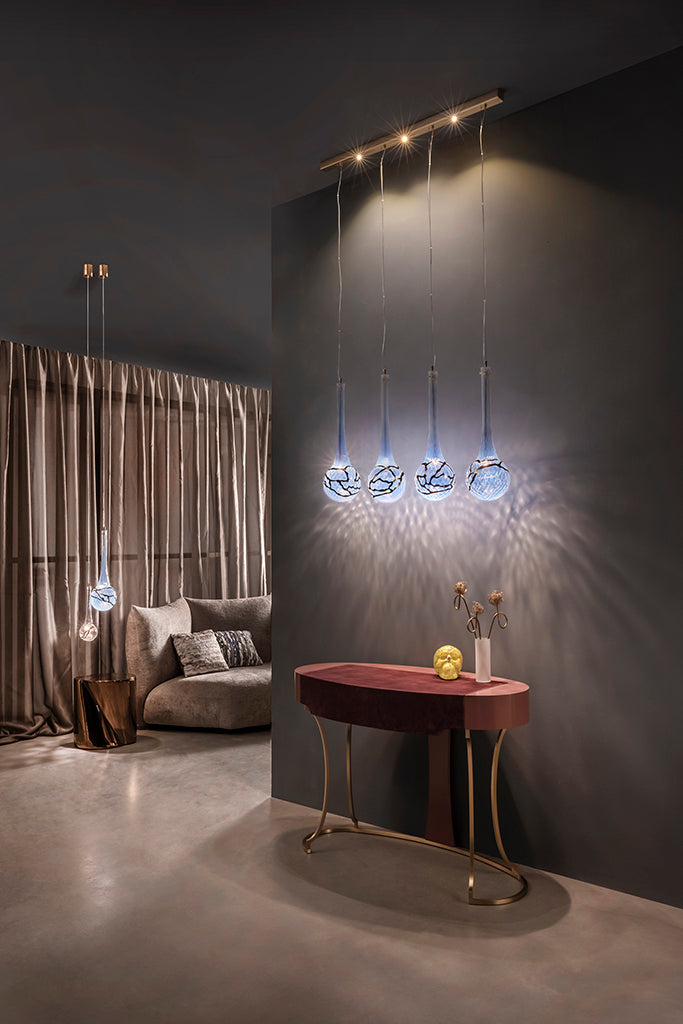 The Gocce di Luna collection captures the soft poetry of blown glass, gently encased within a metal cage. Illuminated through "boegoso" or "balloton" textures, each piece emits a warm vibrancy, casting delicate reflections and shadows that gently animate your space. Fully customisable in size, finish, and configuration, Gocce di Luna transforms lighting into an emotional, decorative experience.