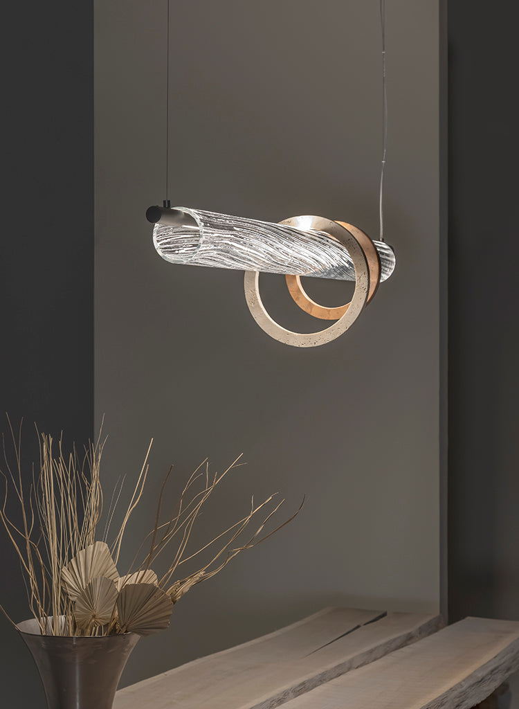 Orbite is an elegant series of pendant lamps that combine Murano glass tubes with polychrome marble discs, built around a sleek central bar. The design plays with concentric geometry, layering materials to create visual depth and refined harmony. Perfect for adding subtle drama and luxury to spaces like dining areas, foyers, or boutique interiors.