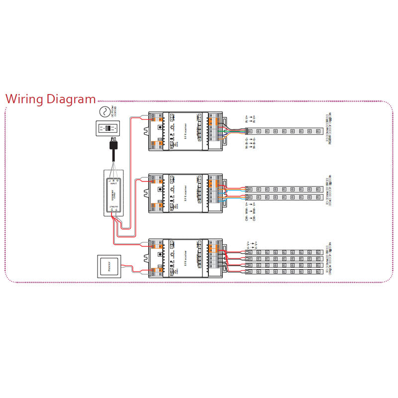 2. Set one receiver as master and pair it to any zone of a remote, and this zone shall only have one receiver which works as master. Set all other receivers as slave and pair them to other zones of the remote, and multiple receivers can be paired to each zone. Then choose all zones on the remote and play the colour changing effects, the master will send sync signal to the slaves to achieve perfect synchronization. The max. sync distance between the master and any slave is within 30m