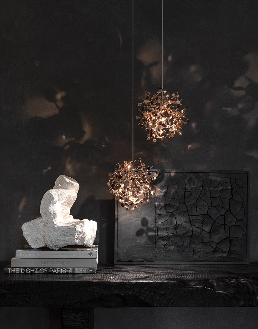 The Core pendant light by Christian Lava draws inspiration from the Earth's natural energy. Its design features vibrant spheres of faceted glass emerging through a metal surface, creating a dynamic interplay of light and shadow. Available in finishes like nickel, black nickel, and gold, this fixture offers a powerful and organic radiance, making it a striking addition to any space.