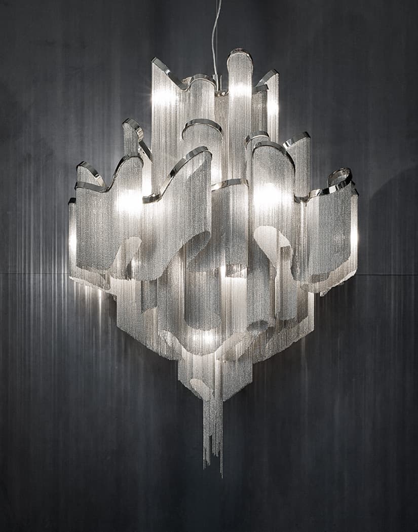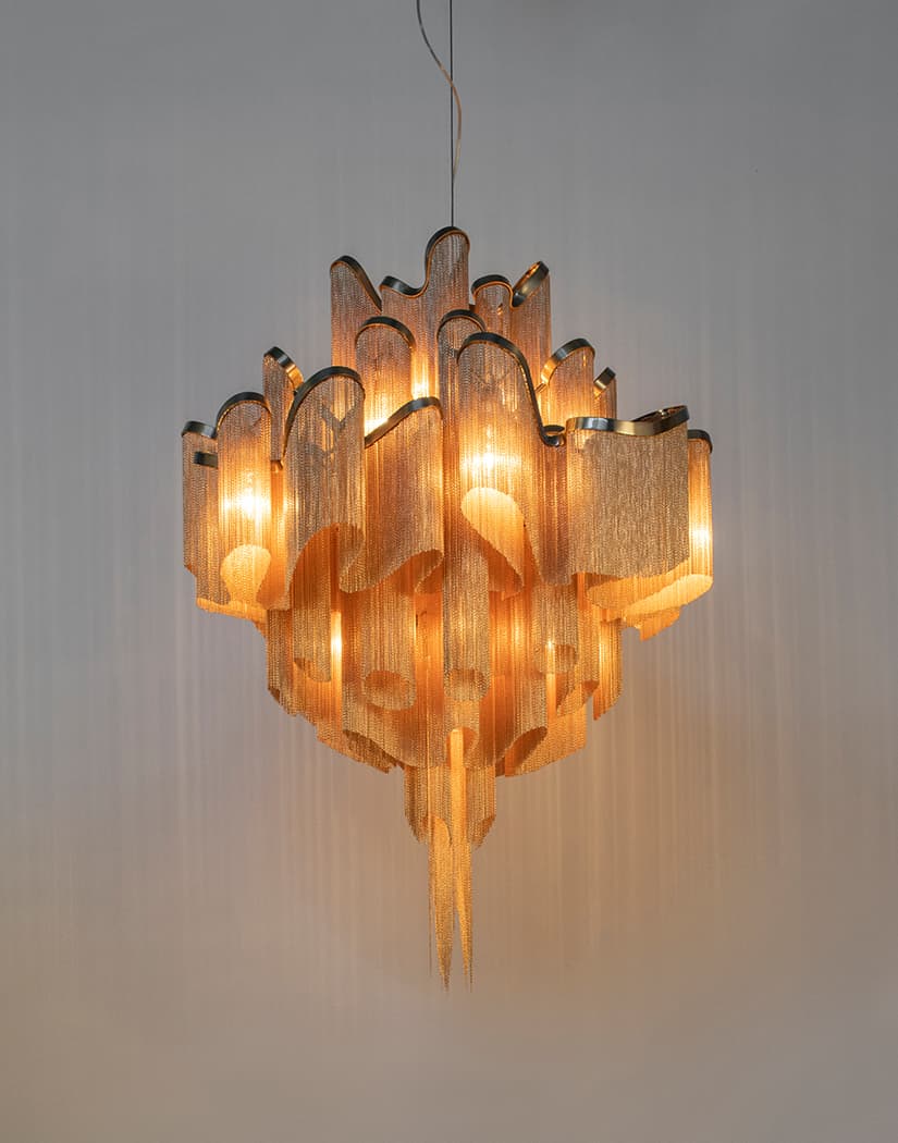 The Stream pendant light by Terzani, designed by Christian Lava, is a striking piece that transforms any space with its dynamic presence. Crafted from over seven kilometers of metal chain, it cascades from a fluid, undulating frame, creating a mesmerizing play of light and shadow. Available in finishes such as nickel, black nickel, and gold, Stream offers a customizable design to suit various interiors. Its design exploits the physical characteristics of the materials used to envelop a room in a unique, immersive light.